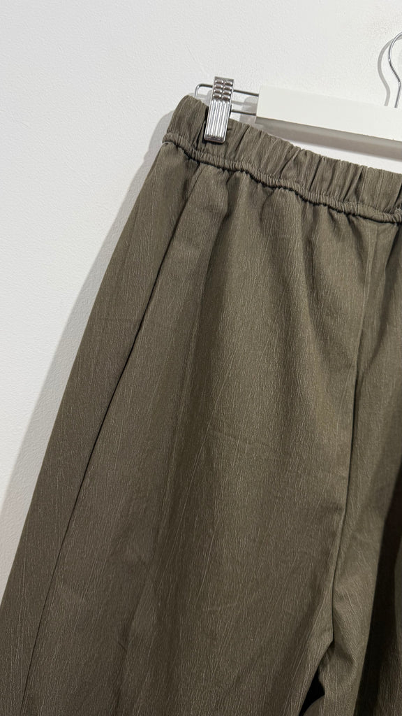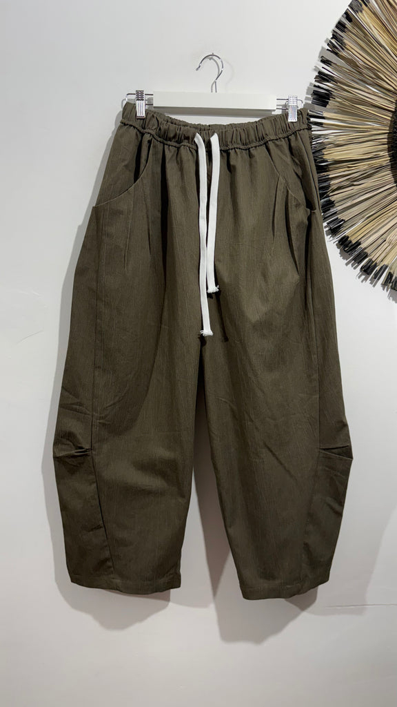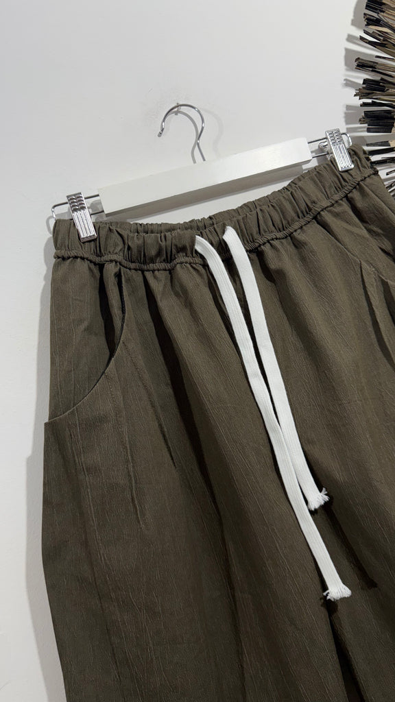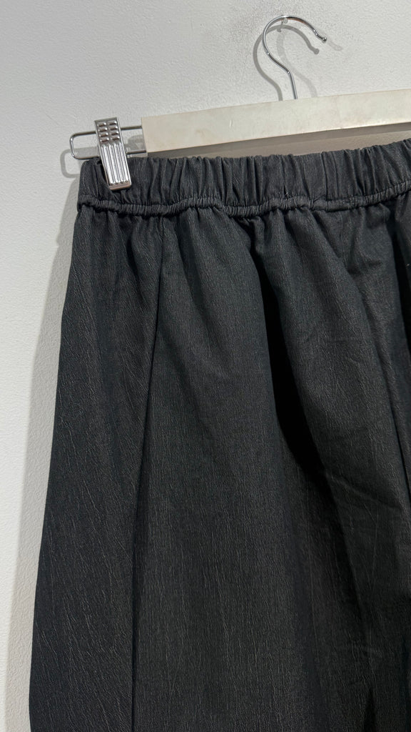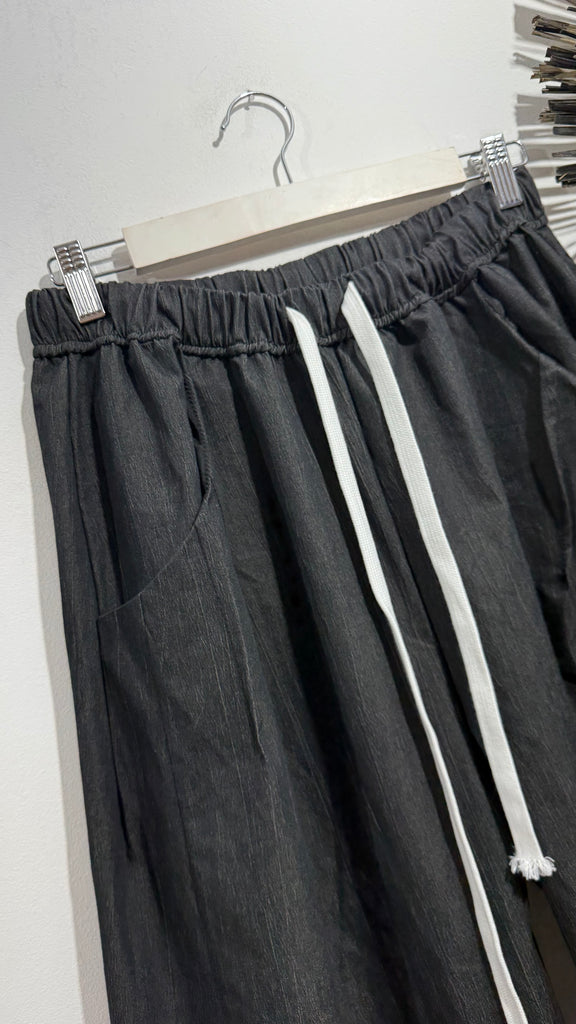 Pantalón de corte Balloon de tejido con estampado lavado vaquero. Tiene goma en la cintura y es elástico. Tiene cordón para ajustar y bolsillos laterales.