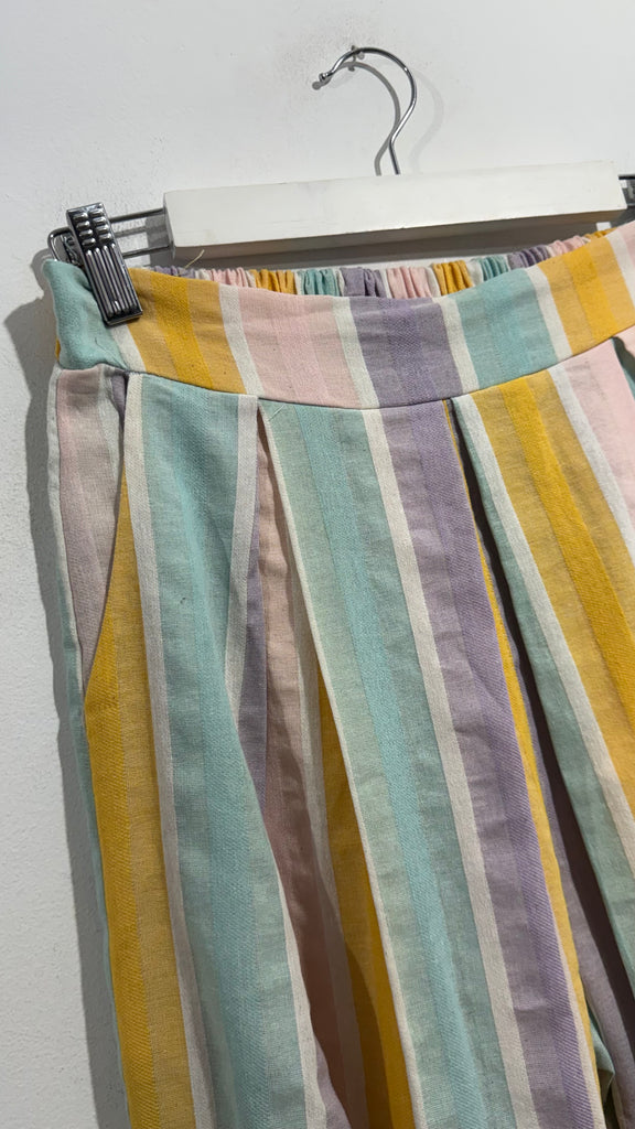 Pantalón de algodón a rayas verticales en tonos pastel. Tiene pinzas en parte delantera y goma en la cintura en parte trasera. Tiene bolsillos laterales. Es de corte recto y tiene un tejido fresco.