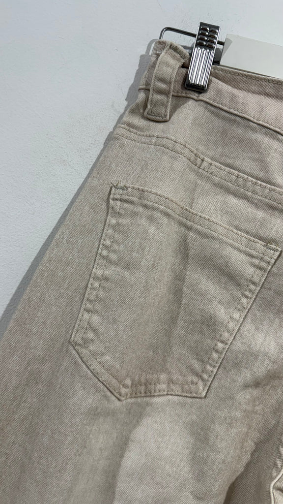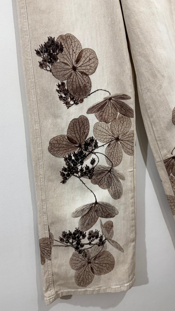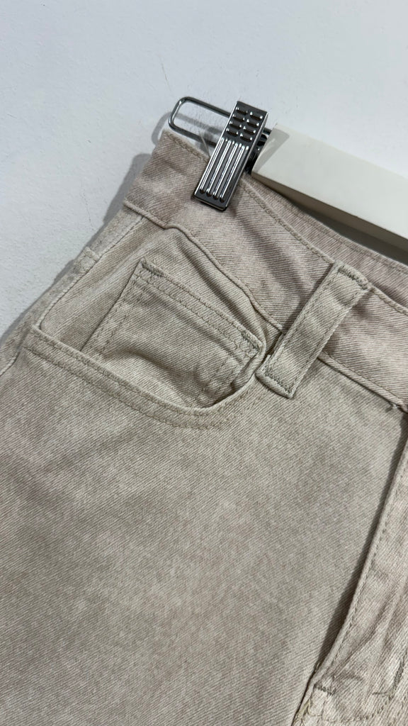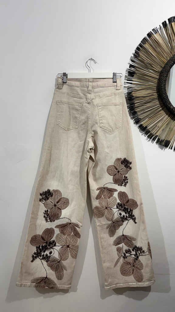 Pantalón de corte recto en tono crudo ligeramente degradado. Tiene flores de tipo 3D desde la rodilla hasta el bajo. Tiene bolsillos en parte delantera y trasera y el dibujo también lo tiene en la parte de atrás.