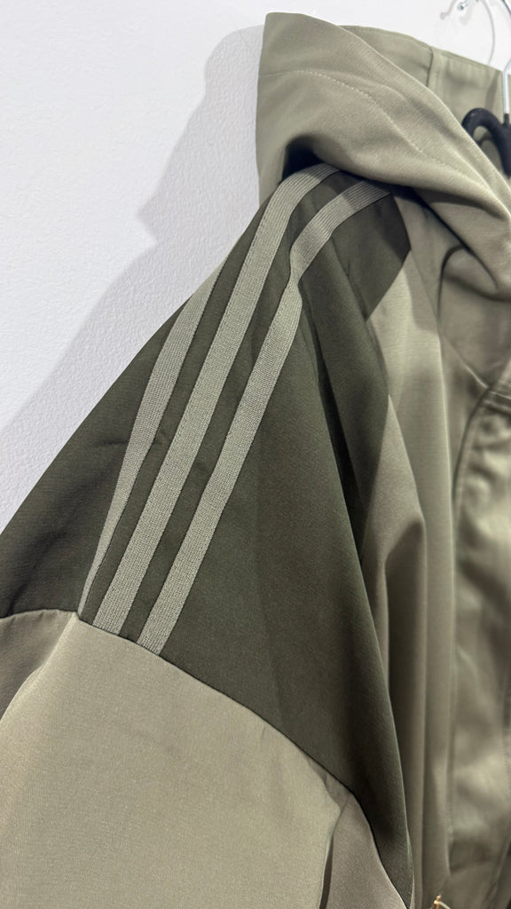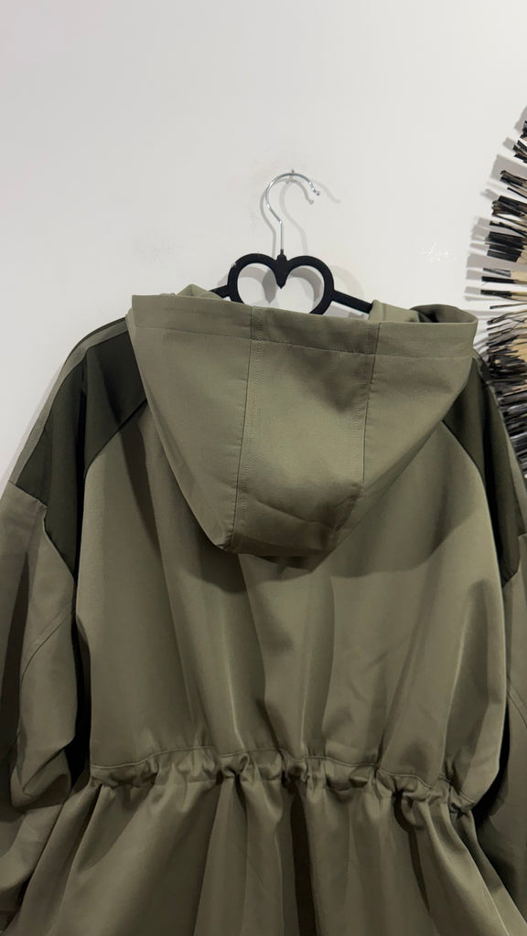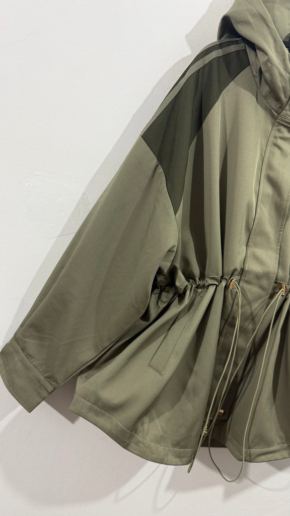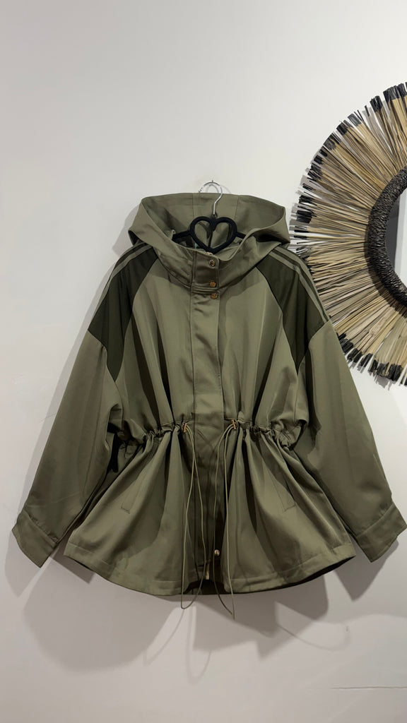 Parka de tejido tipo gabardina en color kaki.Tiene cremallera en parte central, bolsillos laterales y franjas de rayas kaki en la parte de los hombros combinado con un verde más oscuro. Tiene capucha y por dentro va forrada de tela. Tiene goma en la cintura con reguladores para poderlo ajustar.
