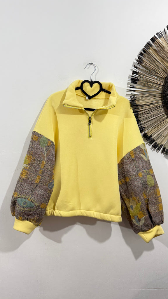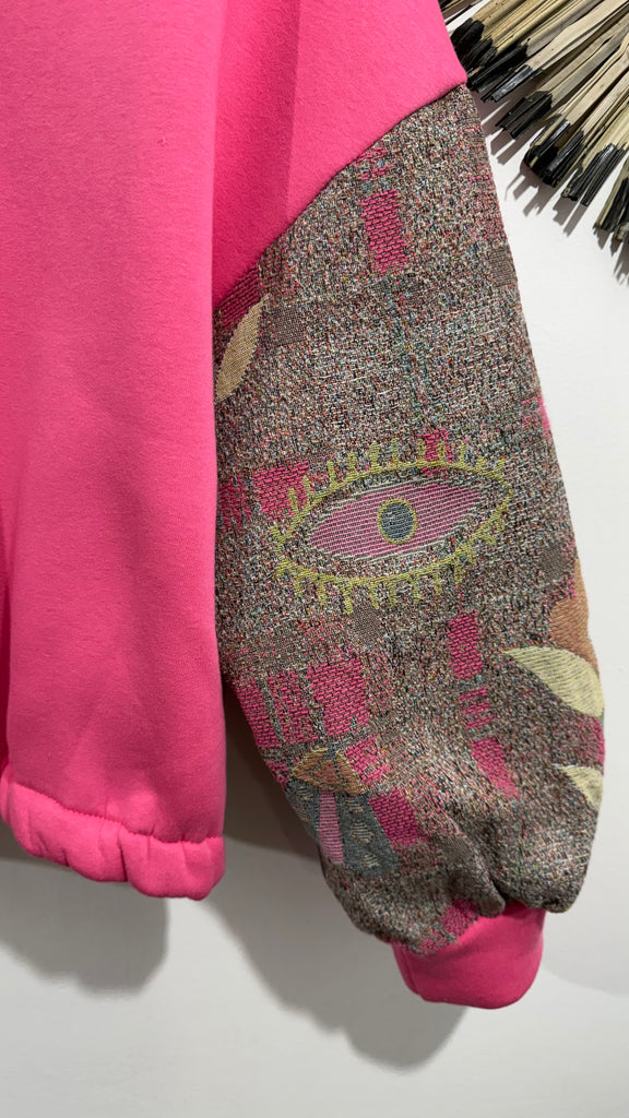Sudadera en color fucsia y amarillo. Por dentro es de franela. Tiene mangas tipo globo con tejido tapiz estampado en varios tonos. Cuello con cremallera.