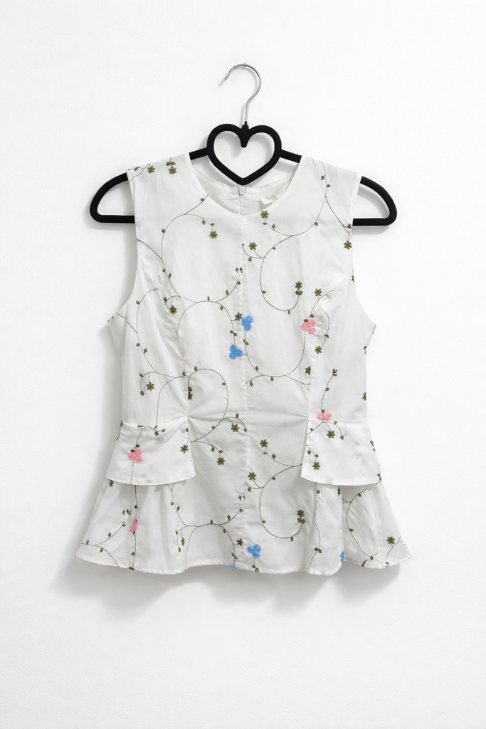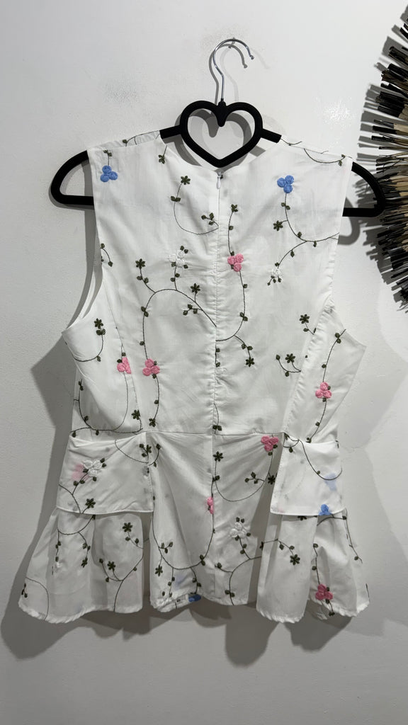 Top de algodón en color blanco, completamente bordado a mano en parte delantera y trasera. Tiene volantes tipo Plumb a los laterales. No tiene el asta. Tiene cuello redondo y cierre de cremallera en parte trasera.