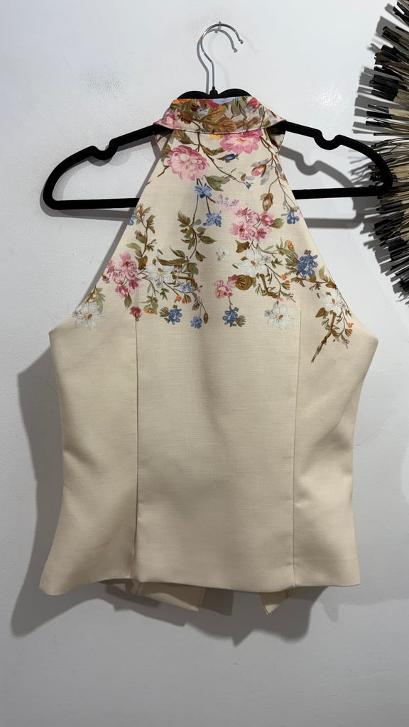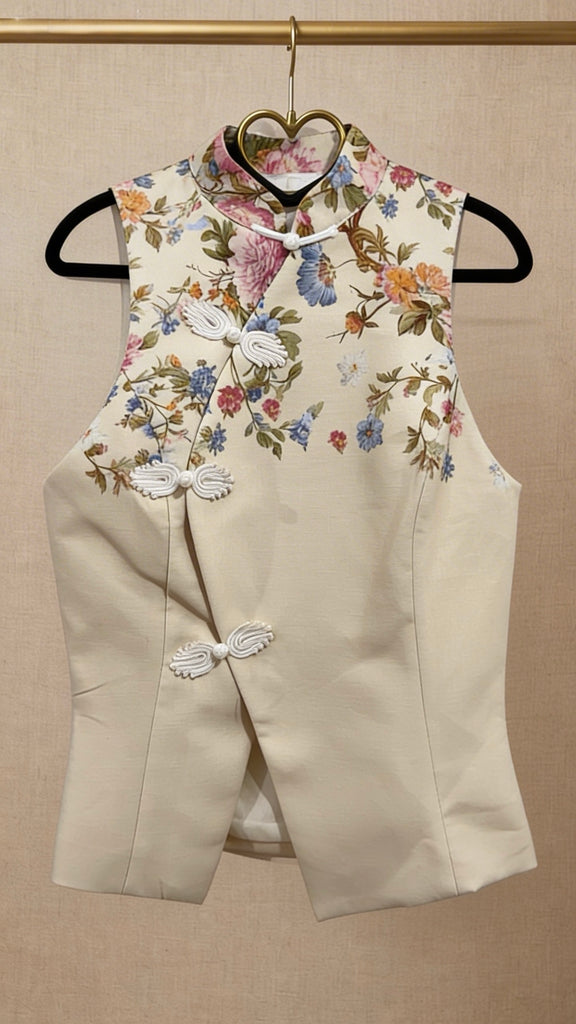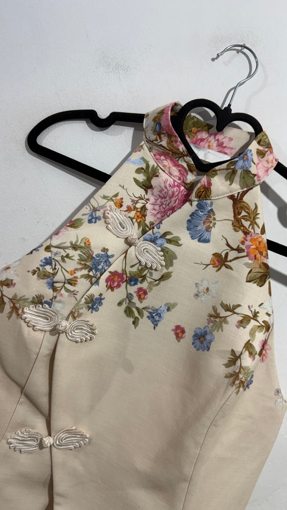 Top de estilo japonés en color crudo con flores en parte superior del cuello y espalda. Es cruzado y tiene cuello Mao. Quedan tal ladito y por dentro va forrado de tela.