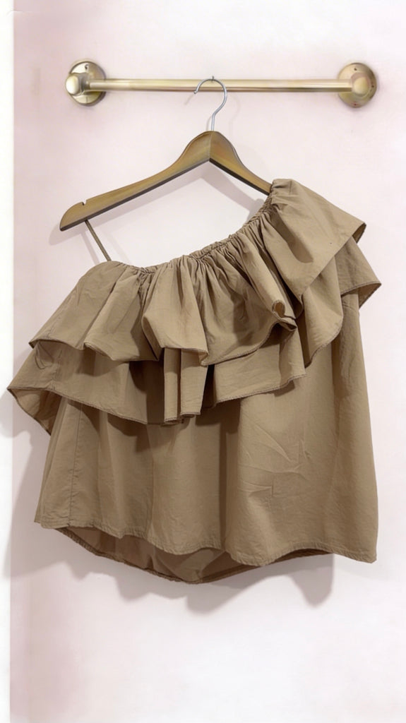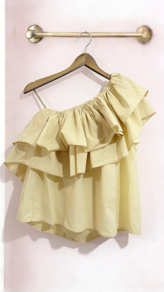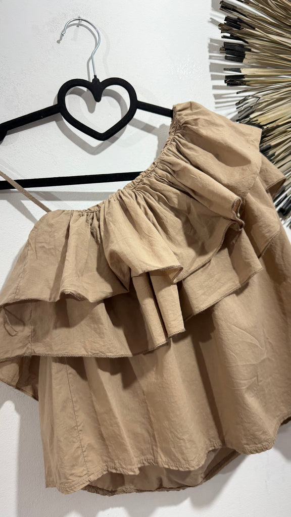 Top de algodón en color Camel en y color amarillo pastel. Es asimétrico y tiene tirante en un hombro y en el otro no. Es cortito y tiene goma en la espalda.