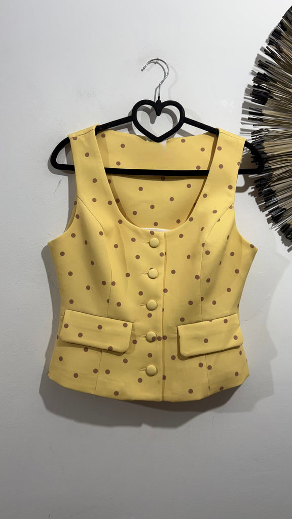 Top de tirante grueso y manga sisa en color amarillo con Topitos en color Camel. Tiene cuello redondo, botones en parte delantera y solapa de bolsillos en parte delantera. Tiene pinzas en parte de atrás. Quedan entallado.