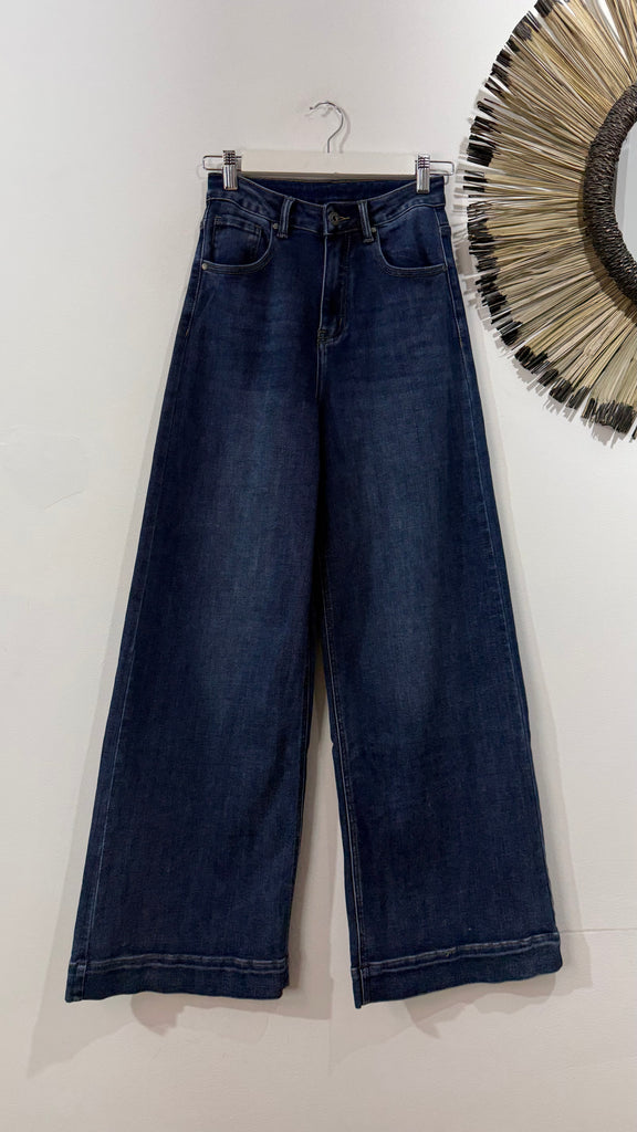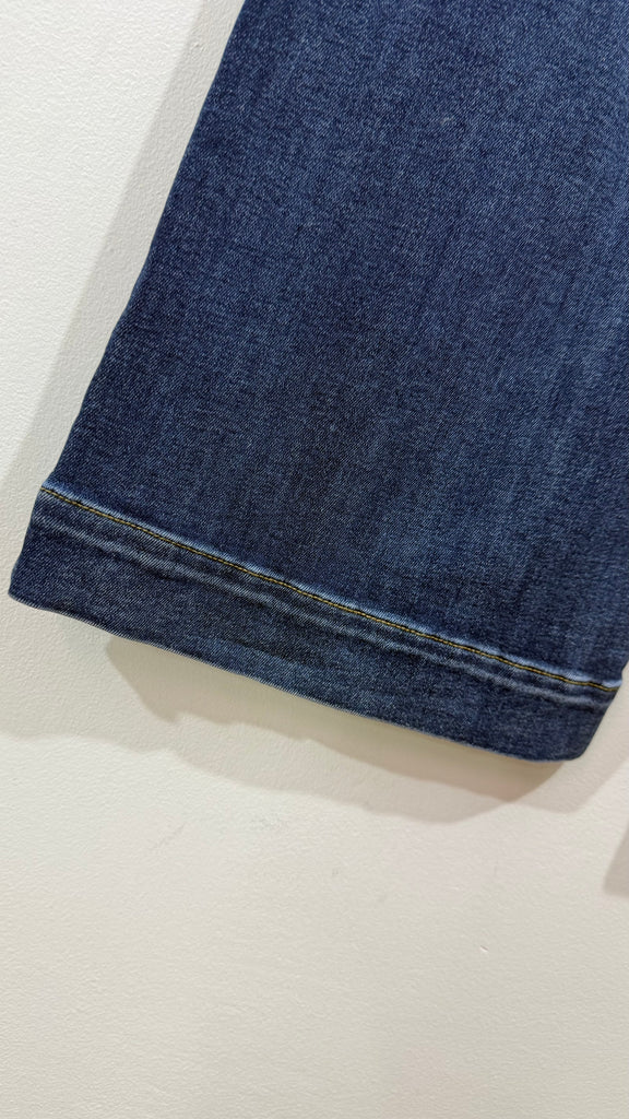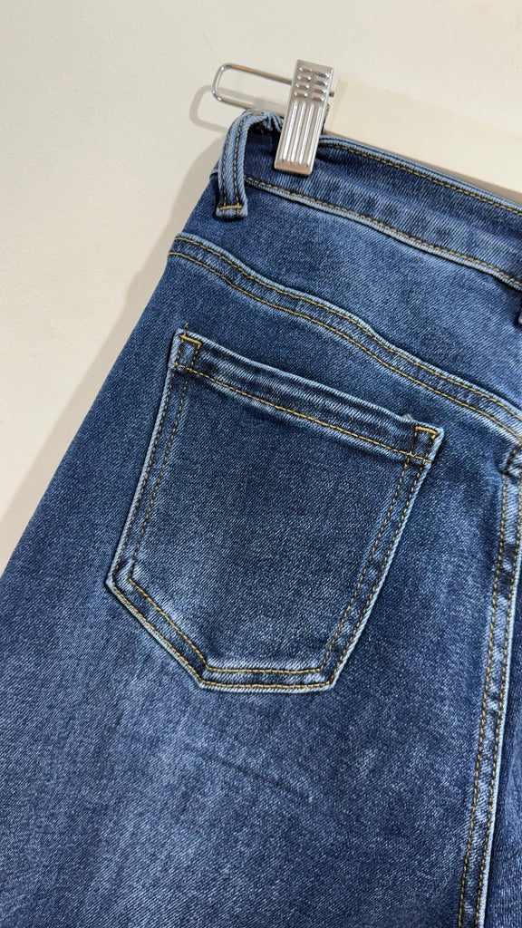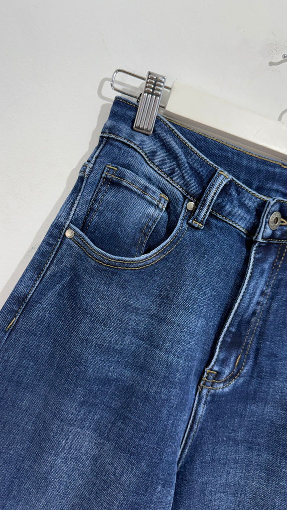 Vaquero de corte recto en tono medio oscuro. Es de tiro medio alto. Tiene elastano y tiene bolsillos en parte delantera y trasera. Tiene bajo con vuelta pespunteada.
