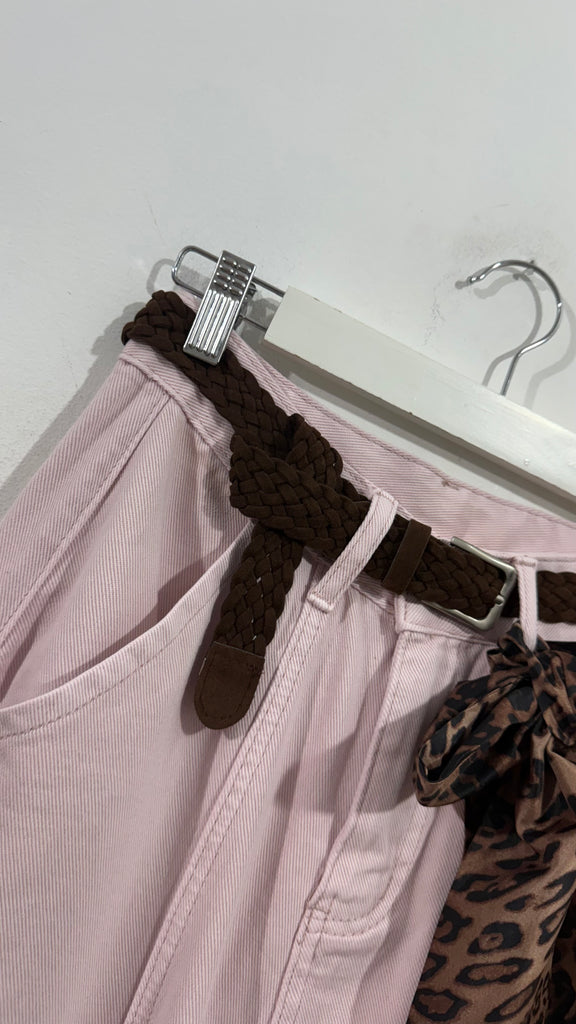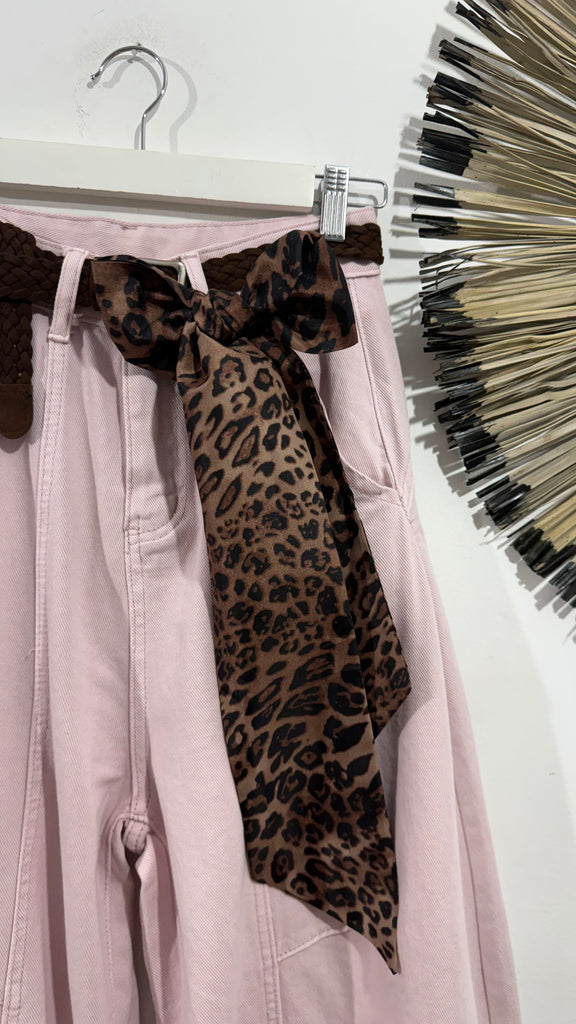 Vaquero de tipo Ballon en color rosa clarito. Tiene bolsillos en parte delantera y trasera. Lleva incluido cinturón en marrón chocolate y pañuelo de animal print. No tiene elastano y es de tiro medio.