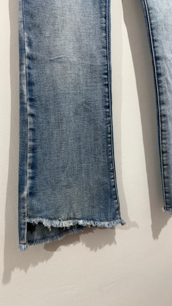 Vaquero elástico en tono medio. Es tobillero y desflecado del bajo. De tiro medio. Bolsillos en parte delantera y trasera. Tiene algún pequeño roto en parte delantera.