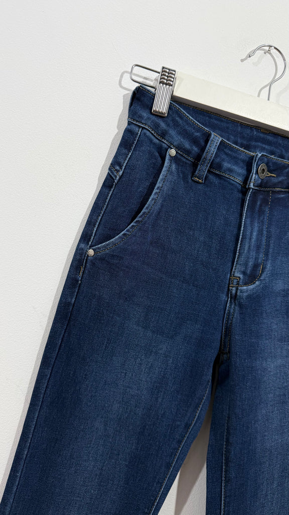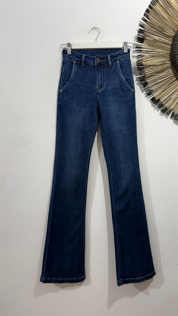 Vaquero tipo chino, elástico en tono básico vaquero. Es de tiro medio. Es pegado de pierna y termina en una campana muy sutil. Tiene bolsillos en parte delantera y los bolsillos de la parte de atrás son tipo chino. Es push up, elástico y se adapta genial. (Se aconseja coger una talla menos a la habitual)