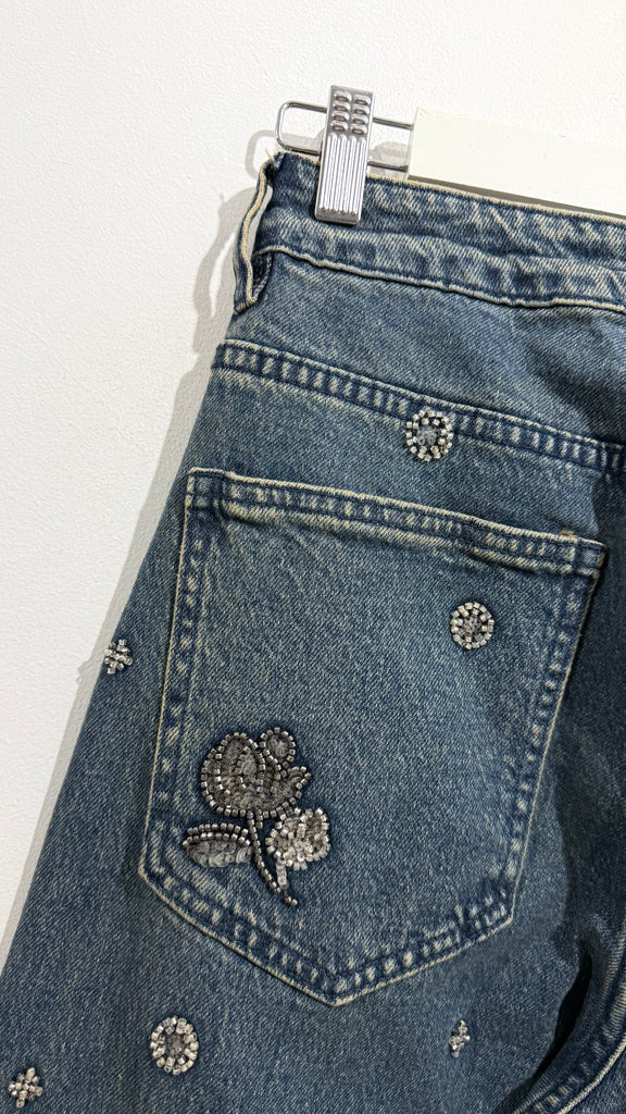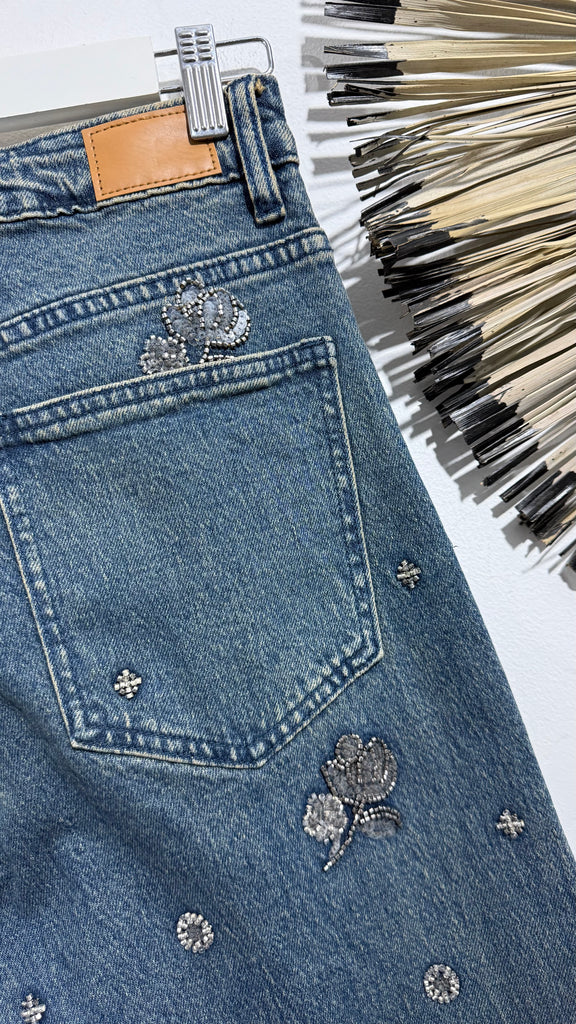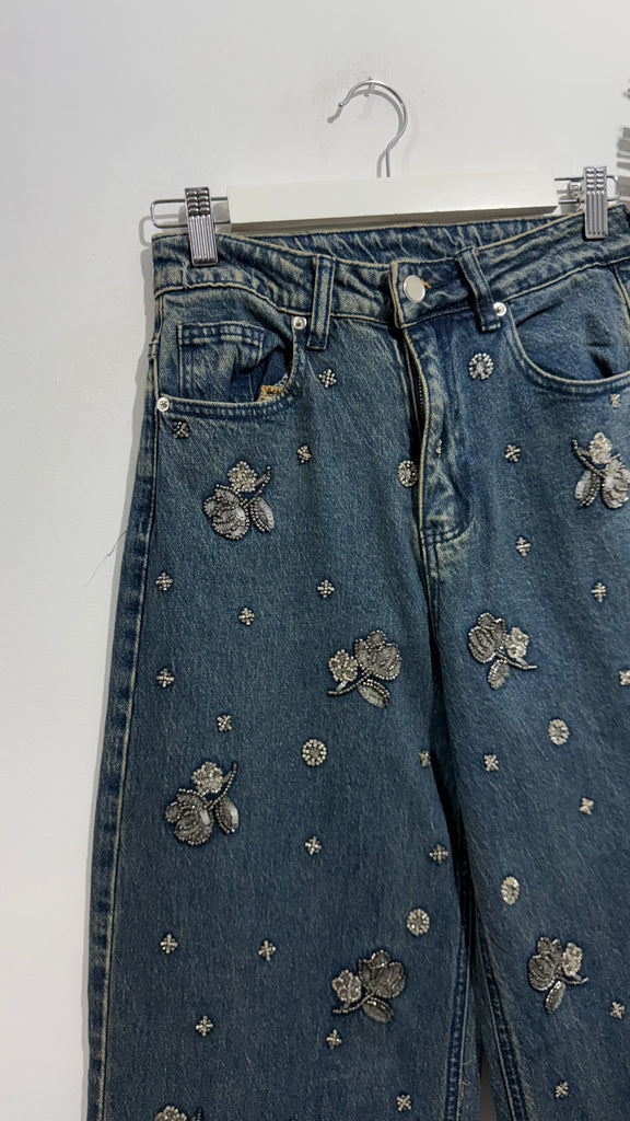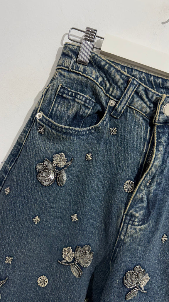 Vaquero de tipo Wide leg en tono oscuro. Tiene lentejuelas plateadas y piedras miyuki plateadas cosidas a mano en parte delantera y trasera. Tiene bolsillos en parte delantera y trasera. (Las prendas de lentejuelas no admiten cambios)